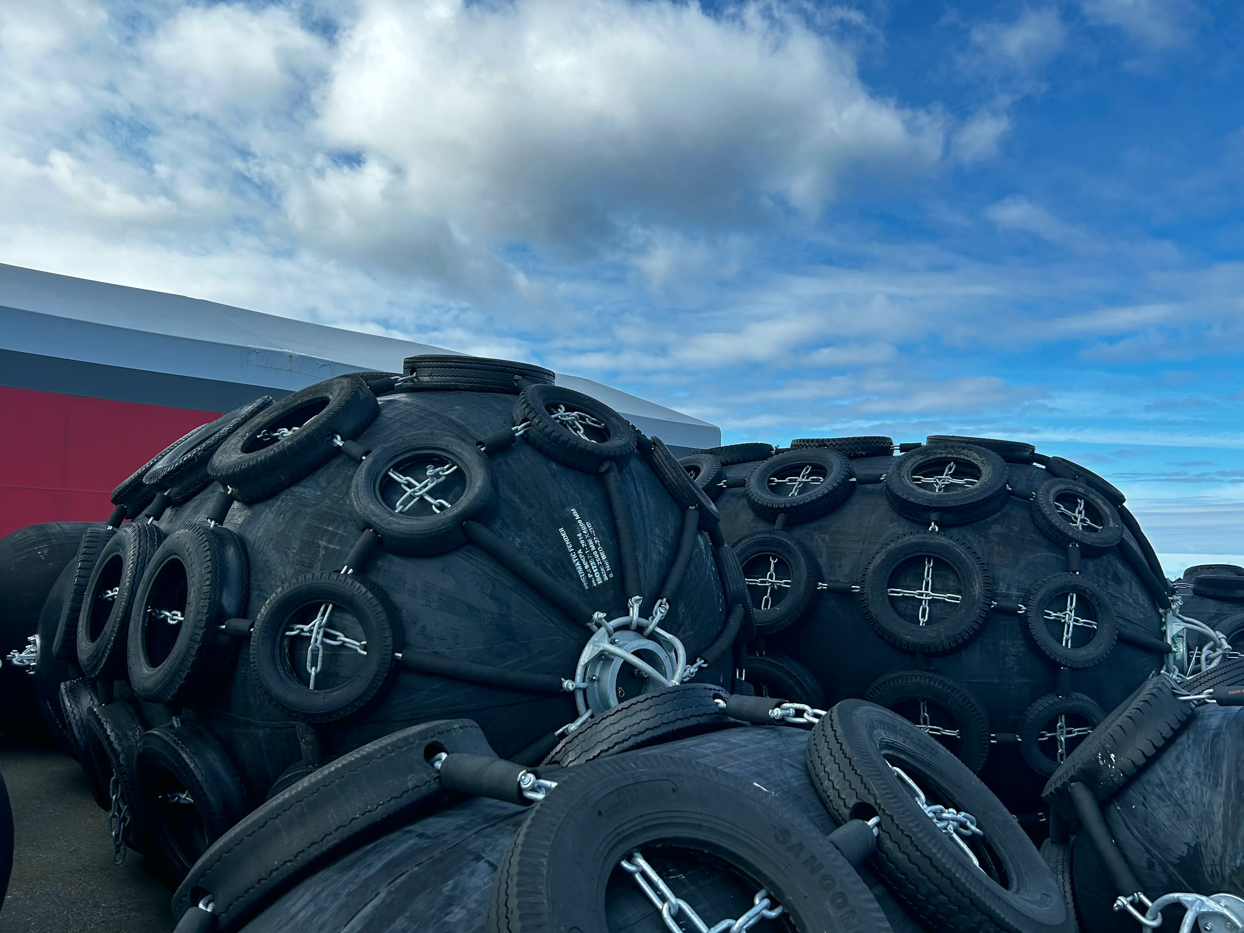The Yokohama Fender style is the most widely used type of Pneumatic Fender. It is a Floating Fender made of rubber and filled with air, that is protected by an array of tires connected and secured by a chain net. These tires protect the fender from friction caused by the ship, and thus, has a long lifespan. For ships that have special security requirements, instead of the conventional car tires, we used the Aircraft Tires Pneumatic Fender, also known as the Aircraft Tires Yokohama Fender style. These aircraft tires are longer and thicker, preventing any contact between the ship and the chains of the fender itself, which can be concerning in scenarios involving oil tankers, or nuclear submarines, for example.